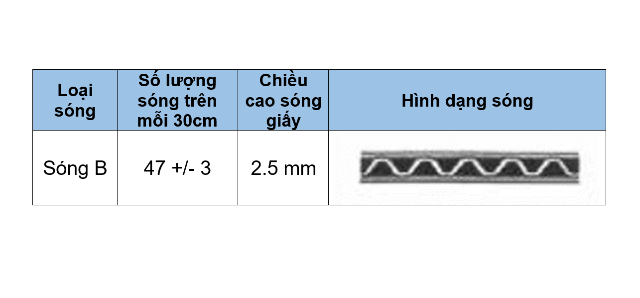 + Lớp sóng B: lớp giấy thường được sản xuất và gấp nếp tạo hình sóng, chiều cao khoảng 2.5 mm, tần số sóng trên 30 cm là 47 sóng, sai số trong 3 sóng. Carton sóng B sẽ giữ vai trò chịu lực tác động đâm xuyên cho giấy carton 2 lớp. Độ dày của lớp sóng B không lớn nhưng tùy thuộc vào mục đích mà sử dụng nó một cách tốt nhất