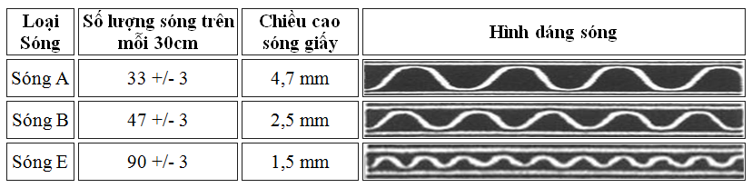 Sóng E là lớp sóng mỏng nhất trong tất cả các loại sóng. Chiều cao sóng giấy của lớp sóng E là 1.5 mm. Số sóng trên 30 cm là 90 sóng, sai số trong vòng 3 sóng.